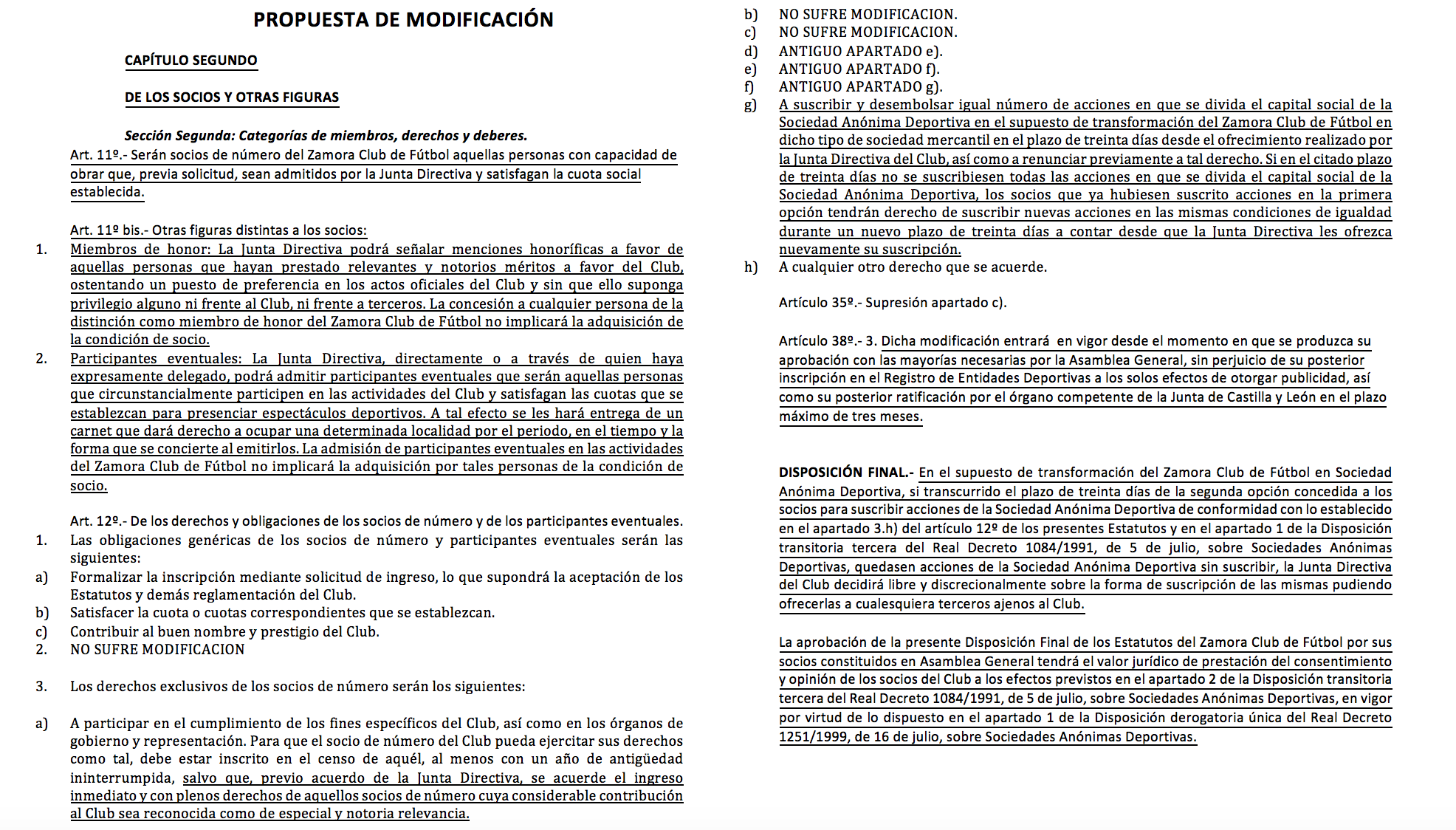 Por el presente, y a efectos informativos, se publican los acuerdos alcanzados entre el Zamora CF y Grupo Vivir, así como una comparativa de los artículos vigentes y las modificaciones propuestas.