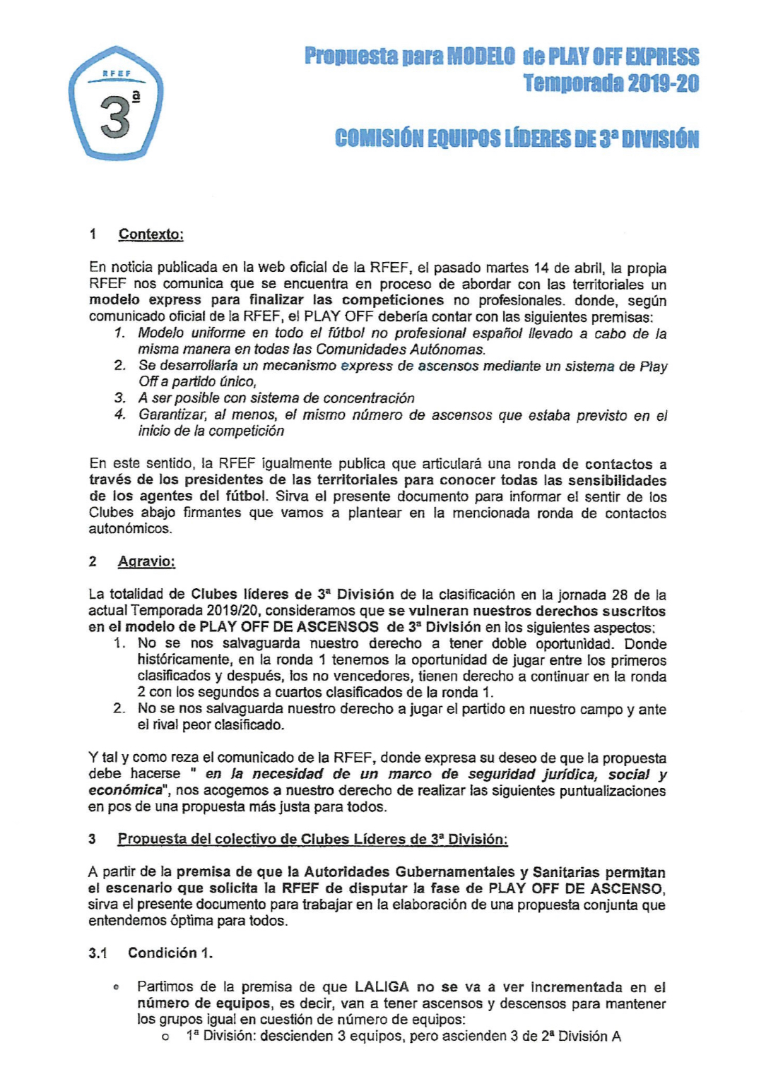 El conjunto rojiblanco se suma a la propuesta de modelo de la Comisión de Equipos Líderes de Tercera, que propone el ascenso exprés para resolver la temporada 2019-2020, mediante el cual, los primeros clubes de cada grupo ascenderían de forma directa.